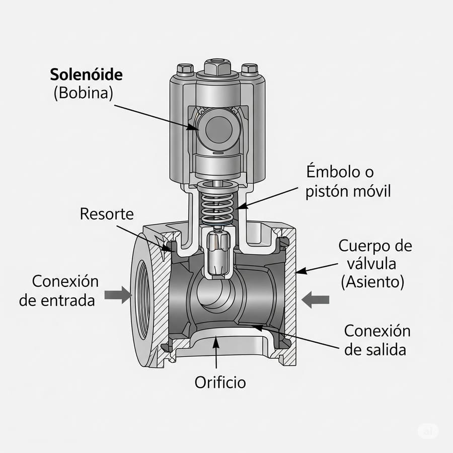 Una electroválvula es un componente electromecánico que controla el flujo de un fluido mediante un solenoide que abre o cierra un orificio de forma automática.