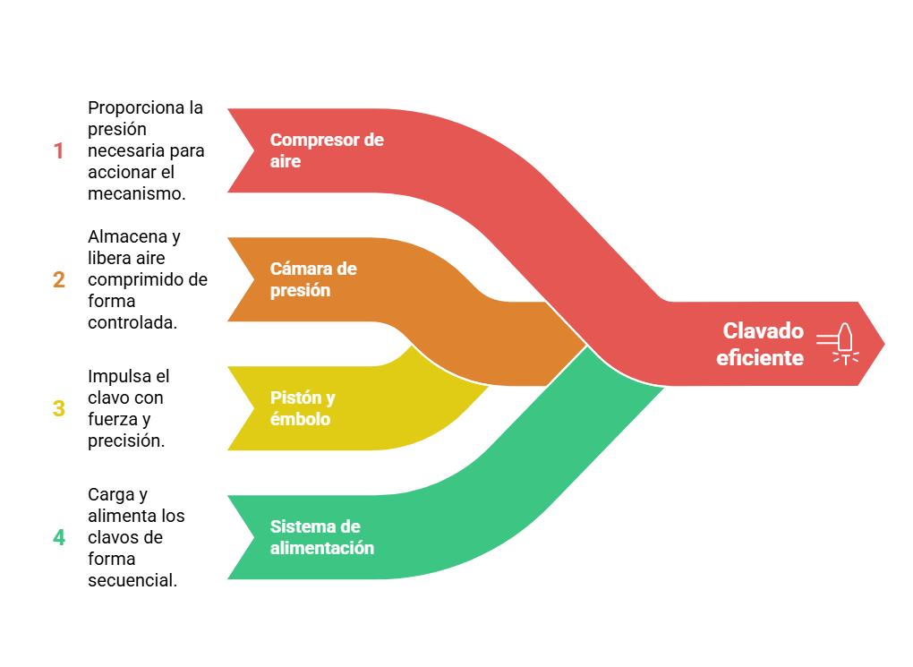 Estas herramientas transforman la energía del aire comprimido en un golpe de alta presión que dispara el clavo en el material. El ciclo se inicia cuando el operador acciona un gatillo o presiona la punta de la herramienta contra la superficie y se efectúa de la siguiente manera:
