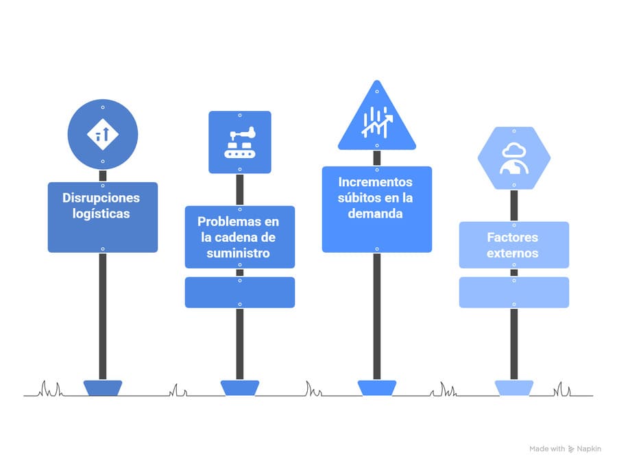 La falta de disponibilidad de insumos rara vez responde a un único factor. Generalmente surge de la combinación de elementos internos y externos que afectan la oferta, los tiempos de entrega y el flujo de inventario. Entre las causas más frecuentes destacan: